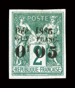 accompanied by a 1998 PF certificate (Yvert 1a Ç900).#1, 1886 "0f05" Surcharge on 2c Green on greenish, unused as usual, four large even margins, especially rich color and strong impression, very fine; signed H. Bloch, A. Brun and accompanied by a 1998 PF certificate (Yvert #1a; €900). (Image) $575.00