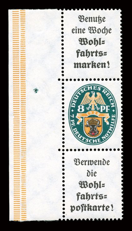 and choice.Michel #S67, 1929 8pf + 7pf se-tenant strip of three with labels at top and bottom, left sheet-margin strip, exceptionally fresh, o.g., n.h. (hinged in selvage only), very fine and choice. (Image) €2,400