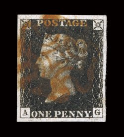 impression on bright paper, red Maltese Cross cancel, extremely fine 2007 PF#1, 1840 1p Black, lettered A-G, handsome used example of the world's first stamp, uncommonly large and balanced margins all around, deep intense color and a prooflike impression on bright paper, red Maltese Cross cancel, extremely fine; 2007 PF certificate (S.G. #1; £375). (Image) $300.00