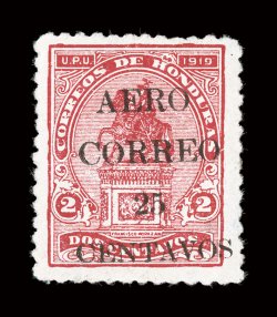 the 25c on 10c Surcharge, this is the rarest stamp of Honduras, wi#C3, 1925 5c Light blue, with red "Aero Correo" overprint, bright color, unused, without gum as are all known examples, corner crease at bottom right, otherwise fine; except for the 25c on 10c Surcharge, this is the rarest stamp of Honduras, with a mere seven copies ever issued; signed Sanabria. (Image) $7,250.00