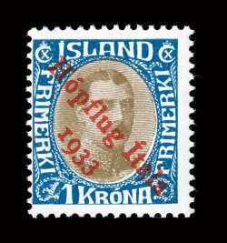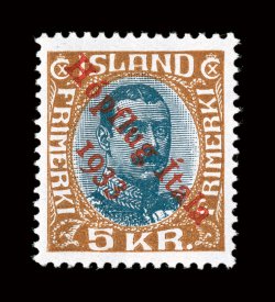 centered, o.g., lightly hinged, there is a tiny trace of a perf. scu#64, 1902-03 10a Carmine, black overprint, perforated 14x13 1/2, a highly desirable mint example, possessing deep radiant color and a vivid impression on fresh white paper, well centered, o.g., lightly hinged, there is a tiny trace of a perf. scuff at bottom mentioned for strict accuracy, very fine; one of the key rarities of the "I Gildi" series; clear 1985 Nielsen and 1992 DFF certificates (Facit #39; SK 75,000). (Image) $9,000.00