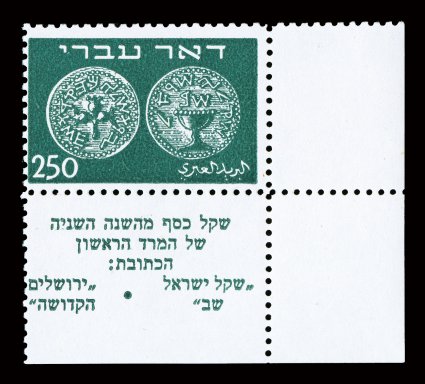 miniscule perf. fault, otherwise a fine-very fine example of this key#7-9, 1948 250m-1000m Coins, each in a full tab, the 250m and 1000m are corner margin copies, strong colors, o.g., n.h., 1000m with just a hint of aging on the gum, 500m with a miniscule perf. fault, otherwise a fine-very fine example of this key and popular set; 250m and 1000m signed Raybaudi. (imagea) (imageb) (Image) $7,500.00