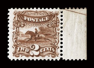 impression on immaculate paper, rather well centered, unblemished full o.#124, 2c Brown re-issue, a pristine right sheet-margin mint example, possessing an overall brilliance and freshness rarely encountered, deep rich color and a sharp detailed impression on immaculate paper, rather well centered, unblemished full o.g., never hinged, very fine overall; the first never hinged example we have ever seen of this stamp; 2008 PSE certificate for a block of four, this being the bottom right stamp. (Image) for hinged $800.00