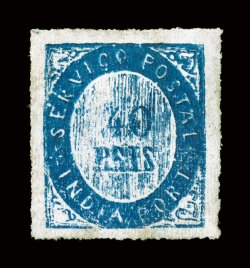 1993 PF certificate the Scott catalog value is for a stamp with small#4, 1881 40r Blue, without gum as issued, bottom sheet-margin single, slight excess overprint ink at bottom, exceedingly fresh, fine; signed A. Brun and accompanied by a clear 1993 PF certificate; the Scott catalog value is for a stamp with small faults. (Image) $1,250.00