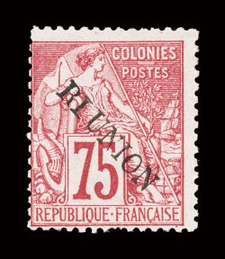 Ç680+).#27, 1891 75c Carmine rose, with "Reunion" ovpt., with variety "RIUNION" caused by broken "E", bright color, o.g., lightly hinged, fine; 2000 Behr certificate (Yvert #27; €680+). (Image) $600.00+