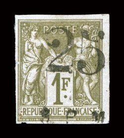 very fine appearance a seldom offered stamp Descher guarantee hand#8, 1885 "25/SPM" Surcharge on 1Fr Bronze green on straw, unused, with small part o.g., full to large margins (tiny nick in the bottom margin), rich color, a couple minor flaws, very fine appearance; a seldom offered stamp; Descher guarantee handstamp on reverse and signed Calves (Yvert #3; €3,500). (Image) $2,500.00