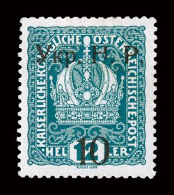 a 1957 Friedl certificate (Michel 87 Ç2,000).#99, 1919 4Hr on 4K Rose on green, position 13, choice centering, bright color, o.g., trivial h.r., very fine; a rarely offered stamp; signed Landre, H. Bloch and accompanied by a 1957 Friedl certificate (Michel #87; €2,000). (Image) $1,100.00