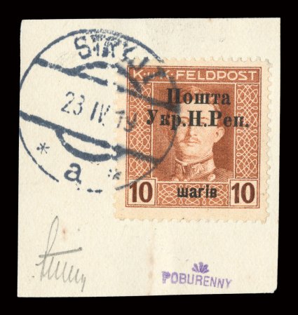 Ç500).#49, 1919 10sh on 10h Orange brown, tied to piece by complete strike of Stryji 23.IV. 19 c.d.s., rich color, very fine; only 150 printed; signed Poburenny (Michel #46; €500). (Image) $850.00