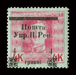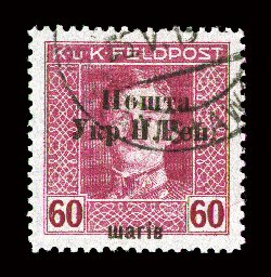 45 were printed signed Korner and accompanied by a 1999 Mikulsk#57, 1919 60sh on 60h carmine rose, position 6, perfectly centered, deep vibrant color, light Stanislau c.d.s., extremely fine; a marvelous example of this rarity, of which only 45 were printed; signed Korner and accompanied by a 1999 Mikulski certificate (Michel #54; €500). (Image) $800.00