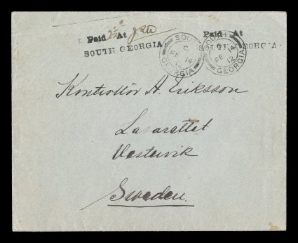 Postmaster at South Georgia) and 2 12p rate, two choice impreS.G. #PH4, 1912 "Paid At South Georgia" provisional handstamp, Heitz type 1c, with large "A" of "At" and with rarely seen manuscript "J.I.W." initials (James Innes Wilson, Assistant Postmaster at South Georgia) and "2 1/2p" rate, two choice impressions of the handstamp, one with manuscript insertions, other without, on cover to Sweden, also bearing two strikes of "South Georgia/Fe 14/12" c.d.s, with original contents, backstamped Vastervik, very fine; all South Georgia provisional handstamps are rare, but the type with "J.I.W." initials is especially desirable, this being one of only five known examples, and the only one with a double impression of the handstamp; a showpiece cover for the finest collection; ex-Styles, Prappas. (Image) £7,500