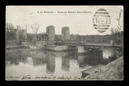 addressed to London and twice forwarded, stamp tied by Falkland Isl"W.F.I." barred oval obliterator, type WF.1, a superb strike on photo side of La Rochelle picture post card, franked with a 1904 1p Vermilion and headed by manuscript "Fox Bay," addressed to London and twice forwarded, stamp tied by "Falkland Islands/C/Ju 11/09" type F.4 c.d.s, the post card was written by the wife of H.M.S. Turner who was Postmaster of Fox Bay from June 1909 until 1911; the only recorded example of this handstamp on a cover carried through the mail; an essential addition to an important collection of Falkland Islands postal history; ex-Heyburn, Prappas. (Image) Est. $4,000-5,000