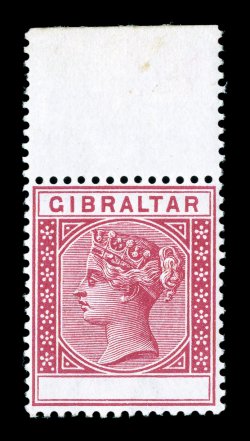 shows just the barest trace of hinging, extremely fine easily one ofS.G. #23b, 1889 10c Carmine, value omitted, a superb top sheet-margin mint example of this rare and striking error, magnificently fresh and well centered, pristine o.g. which shows just the barest trace of hinging, extremely fine; easily one of the finest of the very few discovered; 1991 BPA certificate; ex-Isleham, "Samos" and Gibralter (Scott #30a; $6,000.00). (Image) £5,500