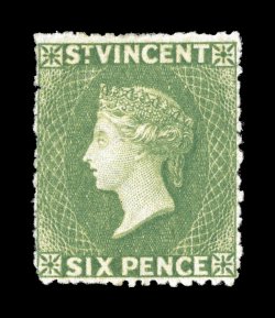 centering as is possible on this issue, intact perforations, extremely fS.G. #2, 1861 6p Deep yellow green, intermediate perf. 14 to 16, an outstanding unused example of this important rarity, possessing deep luxuriant color and about as perfect centering as is possible on this issue, intact perforations, extremely fine; one of the most difficult unused stamps of the Commonwealth and one of the rarest, with only a few known, this perhaps the finest; 1948 RPS certificate; ex-Chapin, Gibralter (Scott #1B; $9,000.00). (Image) £7,500