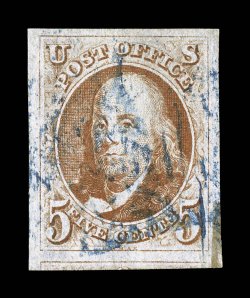 $710.00).#1, 5c Red brown, four full to mostly large margins, especially rich color and a detailed impression, light red grid cancel, extremely fine; 2008 PSE certificate (VF-XF 85; SMQ $710.00). (Image) $600.00