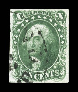 and a 2008 PSE certificate (XF 90 SMQ $415.00).#14, 10c Green, Ty. II, used, large balanced margins on all four sides, especially deep color and a razor-sharp impression, light grid cancel, extremely fine; 2006 PF certificate and a 2008 PSE certificate (XF 90; SMQ $415.00). (Image) $200.00