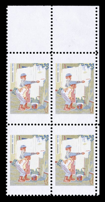 n.h., very fine cataloged simply as four singles.#1470b, 8c Tom Sawyer, red and black omitted, top right corner sheet-margin block of four of this visually striking and rare missing color error, quite well centered, o.g., n.h., very fine; cataloged simply as four singles. (Image) $5,400.00+