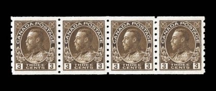 n.h., extremely fine (Unitrade C$500.00).#129, 1918 3c Brown "Admiral", perf. 8 vertical coil, wet printing, highly select strip of four, remarkably well centered and margined, deep prooflike color and impression, o.g., n.h., extremely fine (Unitrade C$500.00). (Image) $220.00+
