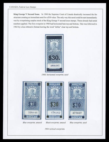 unused, used, multiples and sixteen documents, with nearly all of the rarCanada Federal Law Stamp exhibit collection offered intact on 48 neatly written up exhibition pages, these are the issues for the Supreme Court (Van Dam #FSC1/31), includes unused, used, multiples and sixteen documents, with nearly all of the rare stamps present such as FSC10 (both unused and used), 13, 19, 29-31, in addition there are often unused and used of the same value, including scarce items such as #FS12 and FS20, the 1876 First issue includes five rare trial color proofs, a set without serial number (unfinished specimens), a set overprinted "Cancelled" and three documents, also noteworthy are two documents containing a total of five of the scarce "In Prize" overprints (these overprints are almost never encountered on document), the overwhelming majority is fine-very fine; this is an outstanding basis on which to form a Gold Medal collection of this popular and challenging area. (Image) Est. $10,000-15,000