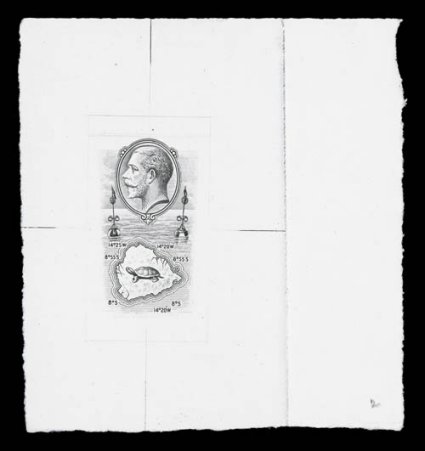 added, shows an error of 8 degrees instead of the proper 7 degrees th1934 Vignette essay in black of the Map of Ascension used on the 1p, 2p 8p and 2/6 values of the series, 65x71mm, an unfinished design with the latitude and longitude lines not added, shows an error of 8 degrees instead of the proper 7 degrees that was used on the final design, very fine and unusual; 2004 Sismondo certificate. (Image) Est. $200-300