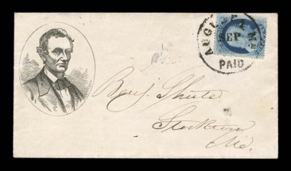 Mechanicsburg, Ind. at bottom right, with ms. date, small ms. note around Lincoln "John Grays man - I will hang them higher than Haman", cover slightly reduced at right affecting the adhesive and with small sealed tears at left, fine appearance. (Image) |