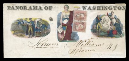 Panorama of Washington Magnus design with multicolored three-panel legal-size Panorama of Washington, horizontal pair of 3c Rose (#65), tied by "Washington D.C. Nov. 26"