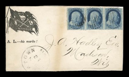 Wis. c.d.s. at bottom, sent to Madison, small central vertical toned band not affecting stamps, design or markings, fine; one of the rarest of the Skull and Crossbones designs, with only a handful known.