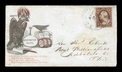 "I think you've Sauce enough, sly bird" red imprint below bird, cotton and "Washington Sauce" design, 3c Dull red (#26) tied by 1861 c.d.s. postmark on cover to Ohio, cover