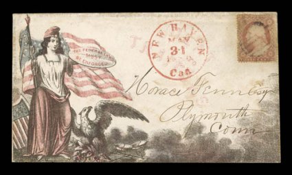 New Haven, Ct. c.d.s. alongside, addressed to Plymouth, Ct., just"The Federal Laws Must Be Enforced" imprint on shield with Lady Liberty and Eagle (Walcott #2164), with light red "Death to Traitors", 3c Dull red (#26) cancelled by grid, with red New Haven, Ct. c.d.s. alongside, addressed to Plymouth, Ct., just a faint hint of toning, otherwise very fine; a scarce and attractive design. (Image) Est. $300-400