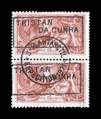 horizontal pairs and with central S.R. AntarcticMy 2522E1921-22 Shackleton-Rowett Expedition, the exceptional set of boxed "Tristan Da Cunha" handstamps on pairs of Great Britain 1/2p to 10/- King George V, the 1/2p to 1/- being marginal horizontal pairs and with central "S.R. Antarctic/My 25/22/Expedition 1921" c.d.s., while the rare 2/6, 5/- and 10/- "Seahorses" are vertical pairs with undated central c.d.s. postmarks, couple of values with small flaws (including some repairing to the bottom right of the 10/-), overall fine-very fine; an almost impossible set to duplicate, as only 40 of each the three high value "Seahorses" are possible; ex-Jack Cole. (imagea) (imageb) (Image) Est. $1,500-2,000