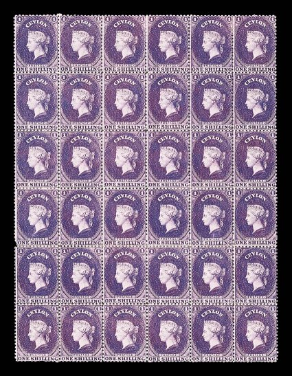 1/- reddish violet, a brilliant mint block of thirty-six (6x6), a few perfs slightly severed and a horizontal gum crease through one row and lower left corner, but