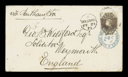 Colombo duplex and showing, on reverse, clear arrival da1871 (21 Feb.) envelope ex the "Welsford" correspondence from Colombo to Weymouth, marked "via Southampton", bearing 9d. blackish brown tied by firm's circular datestamp in blue and Colombo duplex and showing, on reverse, clear arrival datestamp (25.3); some minor peripheral staining. R.P.S. Certificate (1975). Sc. 55a; S.G. 67a. provenance: A. Caspary, February 1958 (Image) Est. $400-500