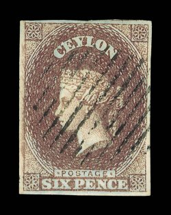 on reverse, calturapost-not-paid handstamp with manuscript date1858 (11 July) entire to London, bearing 6d. purple-brown, a deep shade with close to large margins, cancelled by oval of bars, showing red Paid arrival datestamp (22.8) with, on reverse, "caltura/post-not-paid" handstamp with manuscript date inserted and legible "galle/steamer letter" transit datestamp. A scarce franking with this lovely deep rich shade. B.P.A. Certificate (1983). Sc. 2; S.G. 1. provenance: Baron de Worms, June 1938 M. Burrus, April 1963 Rev. Cornwall-Brooks, March 1979 P.C. Pearson, April 1983 (Image) Est. $2,000-3,000