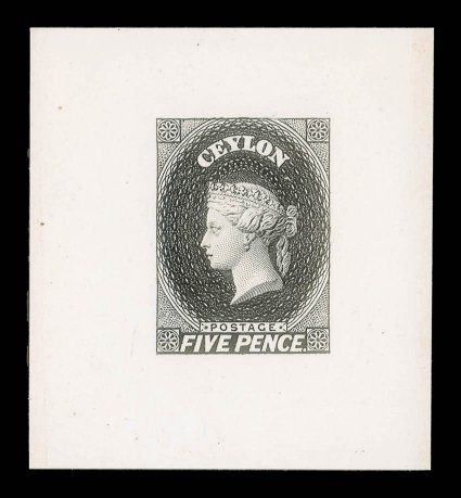 visible, in black on India paper (48x60mm.) affixed to thiMaster design as used for the 4d., 8d., 9d., 1/9d. and 2/- values, taken from the Tasmania 6d. die with the words "tasmania" and "sixpence" obliterated by engine turning but still visible, in black on India paper (48x60mm.) affixed to thin card (57x68mm.); some very minor fox marks, mainly affecting card. Fine and extremely rare, three examples are recorded, one of which is in the Royal Collection. provenance: Dr. Fleming, February 1951 Dale-Lichtenstein, February 1969 (Image) Est. $15,000-20,000
