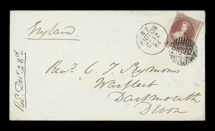 Picton c.d.s. alongside, London and arrival c.d.s. (23.12) on revers1864 (12 Oct.) envelope from Picton to Dartmouth, bearing 6d. red-brown in a lovely fresh bright shade and neatly cancelled by "picton" in circle of vertical bars and with Picton c.d.s. alongside, London and arrival c.d.s. (23.12) on reverse; the envelope with a little light soiling however an attractive franking. Sc. 29b; S.G. 108. (Image) Est. $200-300