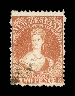 R.P.S.N.Z. (1996) and R.P.S. (2007) Certificates. Sc. 47 va1d. brown showing part "u" and large part "n" of papermaker's watermark in double-lined capitals, inverted and reversed, neatly cancelled with part "2?" in oval of bars; sound. R.P.S.N.Z. (1996) and R.P.S. (2007) Certificates. Sc. 47 var.; S.G. 137b, £550. (Image) Est. $300-400