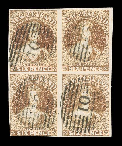 small thin and the block with some pressed wrinkling, otherwise fin6d. brown on hard paper, a block of four with large to very large margins all round, the lower left corner just touched, each clearly cancelled "10" at Wellington; one stamp with small thin and the block with some pressed wrinkling, otherwise fine and a very rare block of fine appearance. Holcombe Certificate (1987). Sc. 9; S.G. 13, £1,200+. (Image) Est. $3,000-4,000