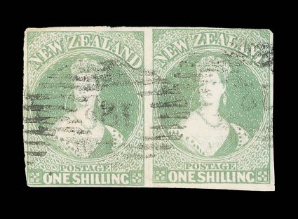 £1,700.1/- dull emerald-green on soft paper, good regular margins and neatly cancelled "1" at Auckland; very fine and most attractive. Holcombe Certificate (1992). Sc. 10a; S.G. 16, £1,700. (Image) Est. $1,000-1,500