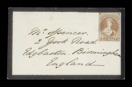 1112 c   1860 (27 Dec.) mourning envelope from Otago to Birmingham, bearing 6d. brown with large to very large margins all round and lightly cancelled 18, despatch and arrival (21.3)
