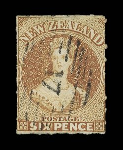 1147 O   6d. brown, roulettes partially all round, cancelled 17 at Christchurch trace of creasing, otherwise very fine. B.P.A. Certificate (1990). Sc. 9c S.G. 29, £2,750. provenance: