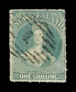 1143 O   1- blue-green, serrates all round, neatly cancelled 15 at Nelson. A fine example. Sc. 10b S.G. 26, £6,500.1/- blue-green, serrates all round, neatly cancelled "15" at Nelson. A fine example. Sc. 10b; S.G. 26, £6,500. (Image) Est. $3,000-4,000