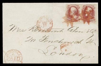 eight-point star NYFM cancels with hollow centers, the single is a May#148, 6c Carmine, a stunning pair of folded entires to London, England, one franked with a single and the other with a horizontal pair, each with stamps tied by fancy eight-point star NYFM cancels with hollow centers, the single is a May 23, 1871 usage and the cancellation is in black, while the entire with a pair (which pays the 6c treaty rate, plus 6c supplementary mail fee) is tied by two stunning strikes of the fancy cancel in red, plus with a portion of the scarce red boxed "Supplementary/Mail" handstamp appears at bottom of entire, both with red New York c.d.s. and London Paid arrival c.d.s., also in red, entire with pair has small edge tear at top, overall a magnificent pair of covers perfect for exhibition. (imagea) (Image) Est. $1,500-2,000