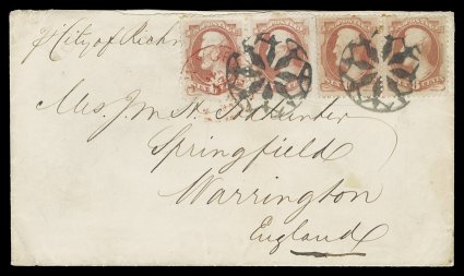 readable red New YorkApr 17SupPaid supplementary mail c.d#159, 6c Dull pink, two horizontal pairs, tied to 1875 cover to Warrington, England by two outstanding strikes of fancy geometric NYFM cancels, one pair also tied by light but readable red "New York/Apr 17/Sup/Paid" supplementary mail c.d.s., Warrington bkst., very fine; a particularly handsome and scarce NYFM supplementary cover. (Image) Est. $750-1,000