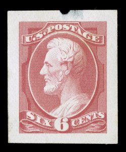 on all existing examples, trivial natural paper inclusion, minor hi#208P2a, 6c Rose, "Panama-Pacific" small die proof on wove, unusually deep rich color that is quite distinctive from the normally issued color, usual slight paper toning as found on all existing examples, trivial natural paper inclusion, minor hinge thin, very fine appearance; no more than five are believed to have been produced; a review of existing examples suggests all of these have flaws to some degree; this most unusual color may have been struck but not used at the Panama-Pacific presentation; ex-Brazer. (Image) $1,200.00