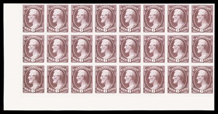 extremely fine a rare and handsome proof multiple.#208aP3, 6c Brown red, plate proof on India, an impressive bottom left corner margin block of 24 (8x3) mounted on card, deep luxuriant color and impression on bright paper, extremely fine; a rare and handsome proof multiple. (Image) $2,400.00+
