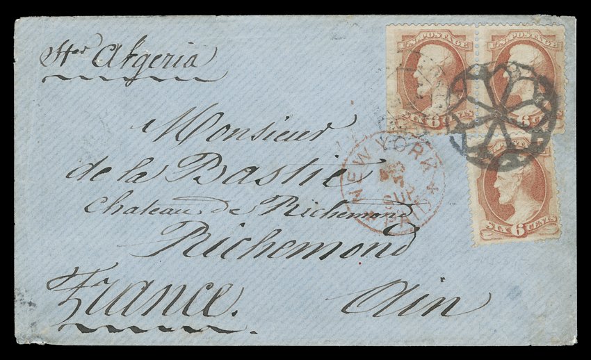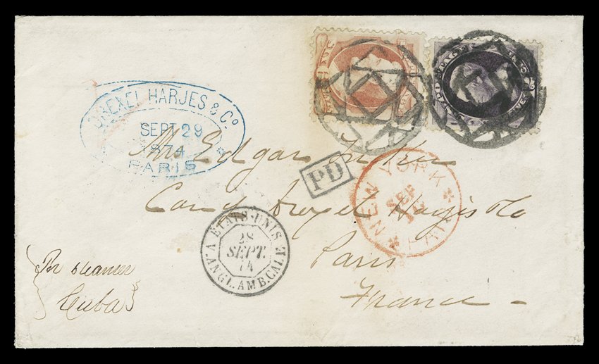 276 c 137, 148, 159 #137, 148, 159, The postal history balance of 40 covers bearing the 6c Lincoln National Bank Note Company issues, grilled and ungrilled, and the 1873 Continental Bank Note Company issues, a select group of covers all having been acquired by Mr. Ainsworth for their unusual usages, cancellations and overall eye appeal, as most were placed in his exhibition collection, begins with 5 scarce covers bearing the grilled 6c stamp (catalog $750.00) each, both domestic and overseas usages, followed by an excellent group of 19 ungrilled 6c covers, with a wonderful range of usages, combination frankings with other values (up to the 30c) and destinations, and concluding with 16 covers franked with the 6c 1873 issue, again with uncommon usages and destinations, some typical cover flaws, but as a whole the condition is well above average and contains many select covers, fine-very fine; an exceptional group either for the Bank Note specialist or cover retailer. Est. $3,000-4,000