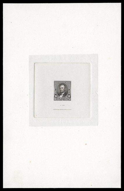 and clean, extremely fine.#222P1, 4c Dark brown, large die proof on India, die sunk on card measuring 74x76mm, showing full die sinkage, with "American Bank Note Co. N.Y." imprint at bottom of India, fresh and clean, extremely fine. (Image) $225.00