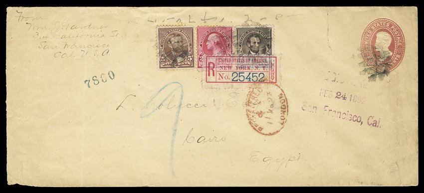 either for its usage, franking, cancellation or destination, interesti#222, 4c Dark brown, postal history collection, the mounted exhibit collection of 23 covers, both domestic and foreign usages, all selected for being a bit out of the ordinary either for its usage, franking, cancellation or destination, interesting domestic usages include a 5c stamp from the same series with a cutout of the 4c vignette, diagonal bisect accepted as postage, couple of Indian Territory usages, registered covers with additional stamps, foreign destinations include Egypt, Italy and Transvaal (front), fine-very fine; a handsome and scarce group perfect for the 1890 Small Bank Note specialist. (imagea) (Image) Est. $750-1,000