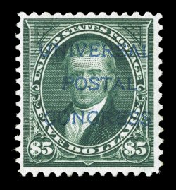 produced in 1897 and distributed to the delegates of the Universal Posta#264SO-278SO, 1895 1c-$5.00 Second Bureau issue, overprinted "Universal/Postal/Congress" in blue, a complete set of all thirteen values, the $1.00 represented by the Ty. II, produced in 1897 and distributed to the delegates of the Universal Postal Congress held in Washington, D.C., only 125 such sets were distributed, deep rich colors throughout (50c bit oxidized), o.g., fine-very fine; quite rare and undercataloged. (Image) $2,000.00