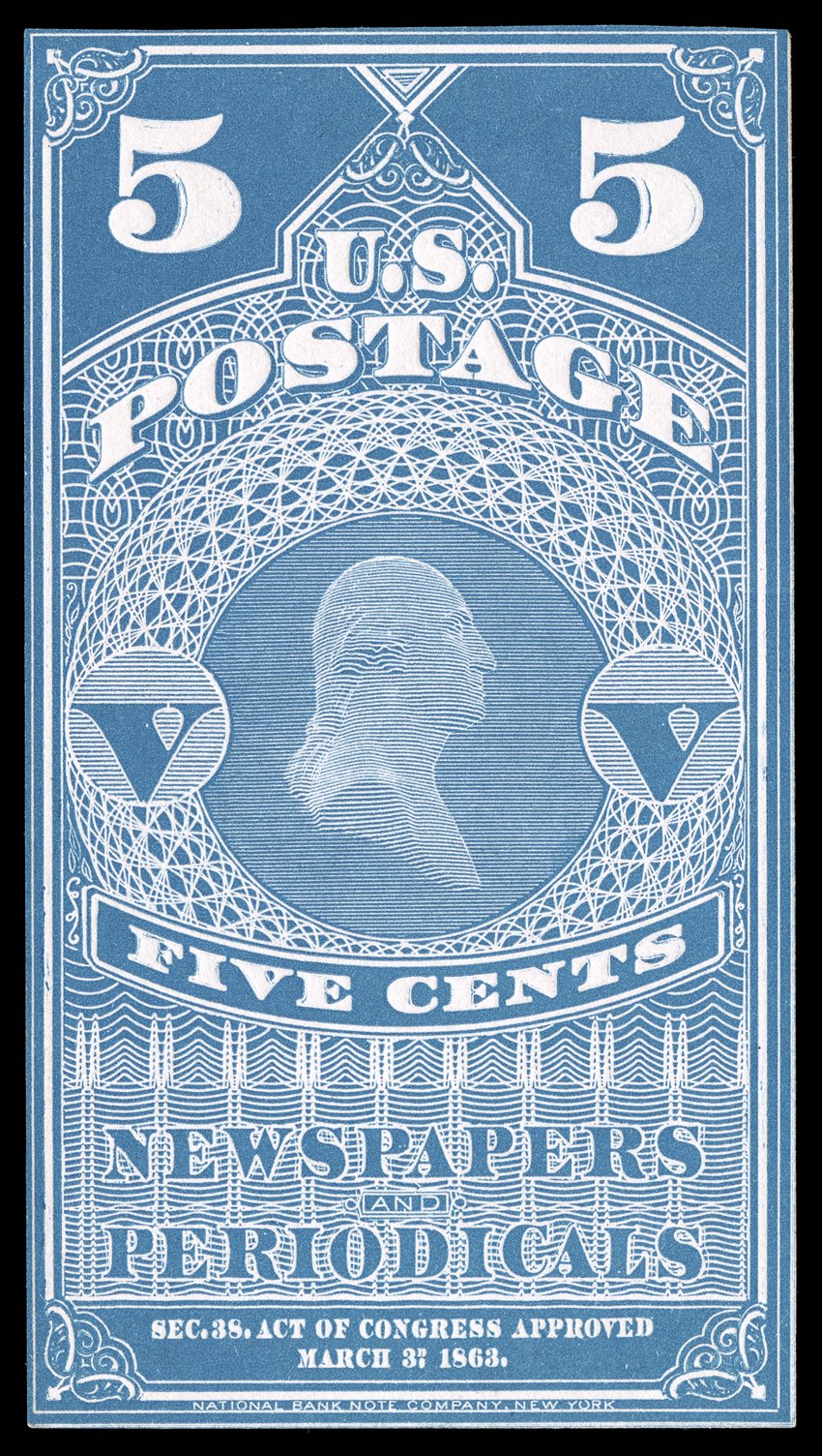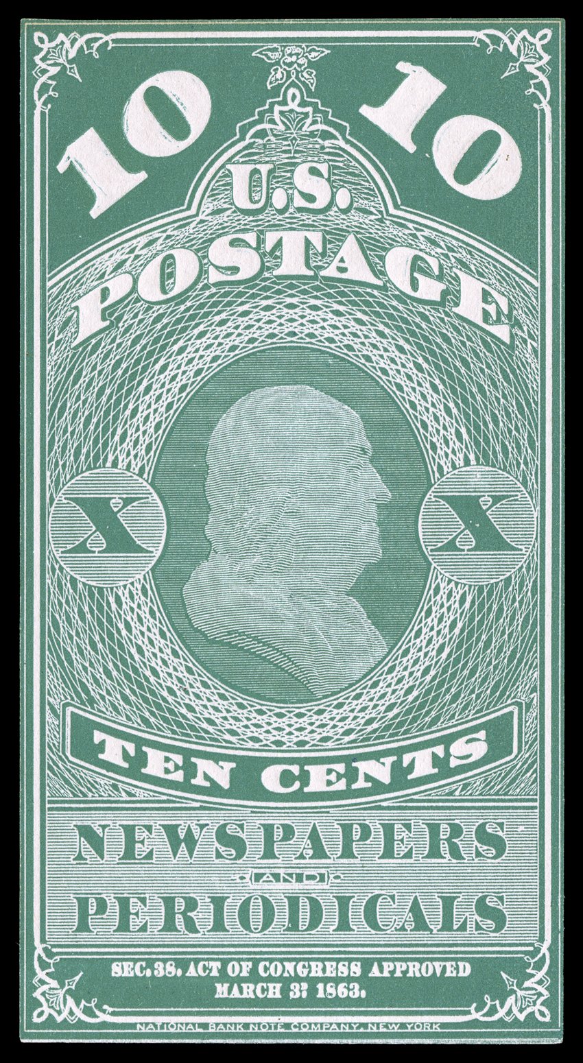 such, well margined, small central mount adhesion on each, 5c with#PR2P4SD-PR4P4SD, 5c-25c 1865 Newspapers, plate proofs on card, each with Ty. D "SPECIMEN" overprint, a very rare and possibly unique set of all three values, unlisted in Scott as such, well margined, small central mount adhesion on each, 5c with faint thin spot, very fine. (Image) Est. $500-750