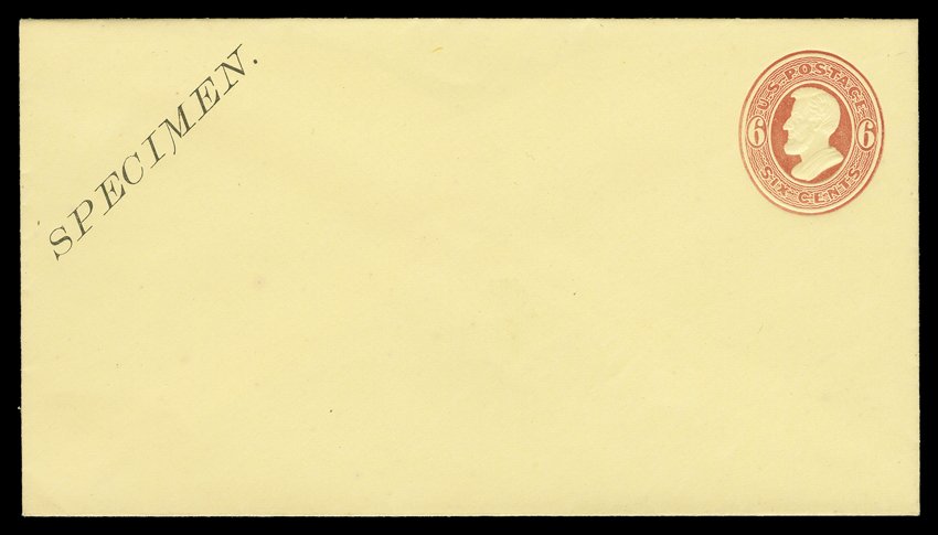 the various forms and sizes, in addition to the various colors of t#U181S-U184S, 6c Lincoln, Plimpton stamped envelopes, with "SPECIMEN" overprints, the marvelous mounted exhibition collection of an impressive 35 different envelopes collected by the various forms and sizes, in addition to the various colors of the indicia and the envelopes themselves, incredibly comprehensive and nearing completion, includes many scarce and seldom seen items including the elusive 6c Red on fawn, small size 8, which is only known with a "SPECIMEN" overprint, all wonderfully annotated on sixteen exhibition pages, almost all very fine, except for some of the "Statement of Quality" specimen envelopes that were often displayed in frames in various Post Office locations so the public could see what envelopes were available; a most remarkable assemblage that took years of diligent searching by Mr. Ainsworth to assemble such a comprehensive showing; many are ex-White. (imagea) (Image) Est. $750-1,000